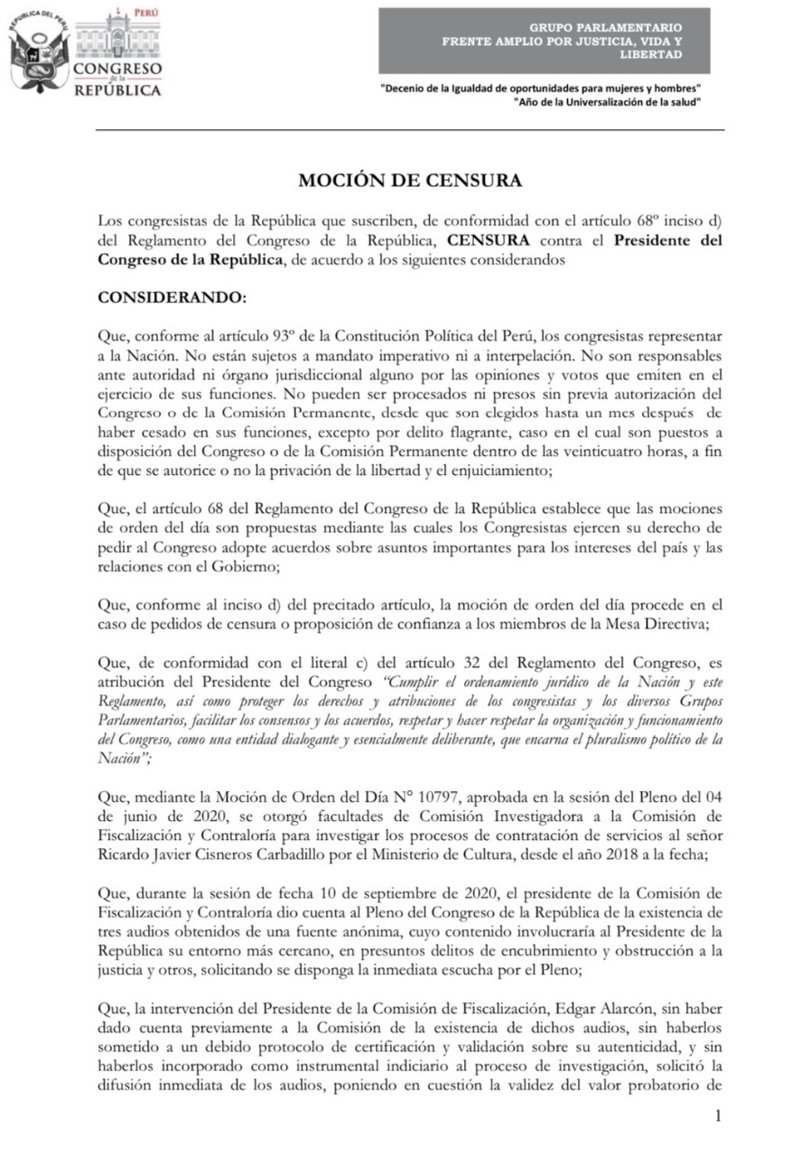 El Dossier On Twitter Bancada Del Frenteampliope Presenta Mocion De Censura Contra El Presidente Del Congresoperu Manuel Merino Lleva Las Firmas De Congresista Pavese Y Otros Cinco Miembros De Su Agrupacion Https T Co Mf4rhqpcae from pbs.twimg.com El fujimorista héctor becerril informó que 35 firmas respaldan la moción, la que será presentada este martes por una cuestión de cálculo político. Otro de los mecanismos para hacer efectiva la responsabilidad del consejo de ministros o los ministros es el rechazo de la cuestión de confianza. Las mociones de molano en el congreso se efectuarán en paralelo a la gira que ha emprendido por ee.uu. Intento de degaste del gobierno socialista. Adicionalmente, la salida del ministro es una. Sin embargo, en el caso de la cuestión de confianza únicamente se necesita mayoría simple de los diputados para que ésta salga adelante. La primera moción de censura que se presentó tras la aprobación de la constitución fue en mayo de 1980 y la plantearon los socialistas contra adolfo la segunda cuestión de confianza la planteó felipe gonzález el 5 de abril de 1990 para pedir una especial política de diálogo que permitiera. La cuestión de confianza es una opción para probar el buen rumbo del gobierno desde dentro, en cambió la moción de censura se genera desde fuera del gobierno, siendo la oposición, la encargada de ponerla en marcha.