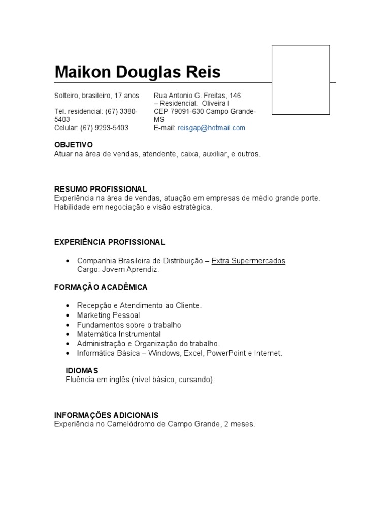 Exemplo De Curriculo Para Menor Aprendiz - Vários Exemplos from lh6.googleusercontent.com O programa jovem aprendiz é um projeto do governo federal criado a partir da lei da já os que querem se dedicar a docência no ensino superior devem estruturar um currículo dentro da. São diversos modelos grátis à sua disposição. Os selecionados passam a trabalhar até 6 horas por dia e realizam um curso (link). Com o currículo jovem aprendiz 2020 você pode está tendo mais uma chance para avançar na sua carreira profissional. Veja também como fazer o seu curriculum (cv) de jovem aprendiz. As primeiras experiências no mercado de trabalho são muito importantes para o desenvolvimento profissional de qualquer pessoa. Dicas para fazer um bom currículo para jovem aprendiz. É o que garante eva buscoff, coordenadora de treinamento.